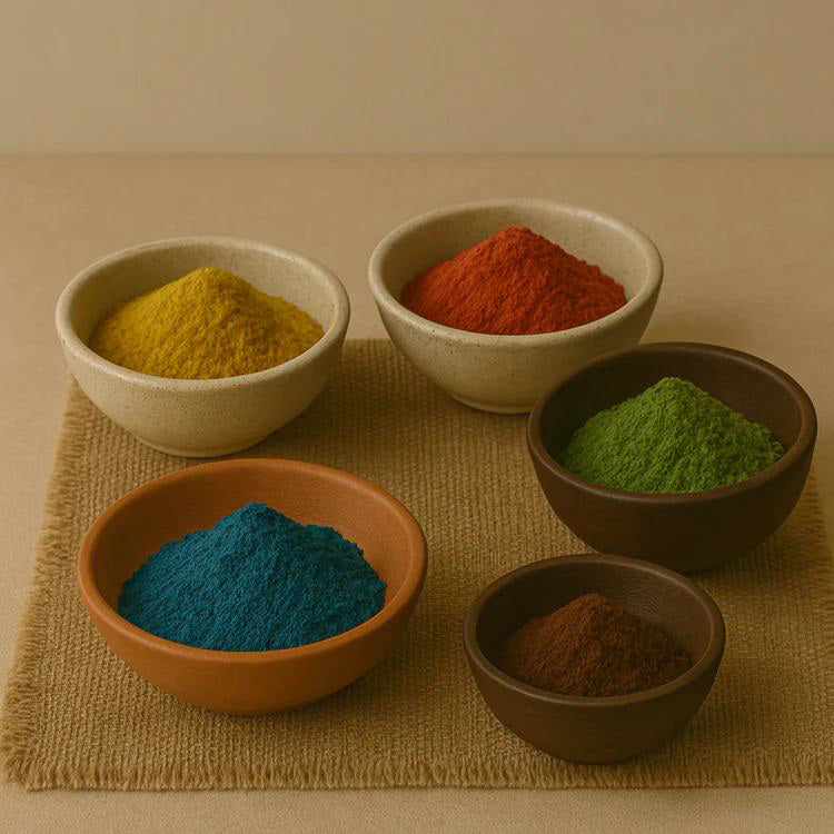Our partners honour traditional methods, using time-tested processes that protect the integrity of each plant while coaxing out its fullest, most beautiful colour. From hand-harvesting to sun-drying and slow grinding, every step is done with intention and reverence for the land.